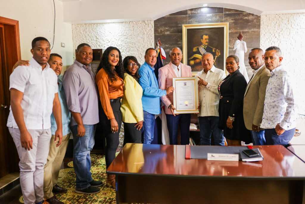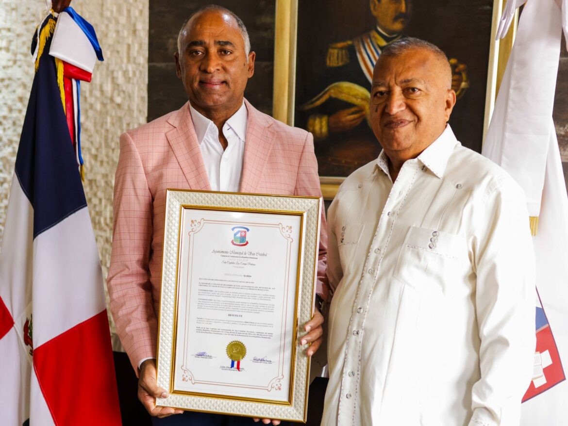 El alcalde de San Cristóbal, Nelson de la Rosa (der. en la imagen superior), entrega una resolución municipal al senador electo de la provincia Peravia por sus aportes al desarrollo de la región Sur.