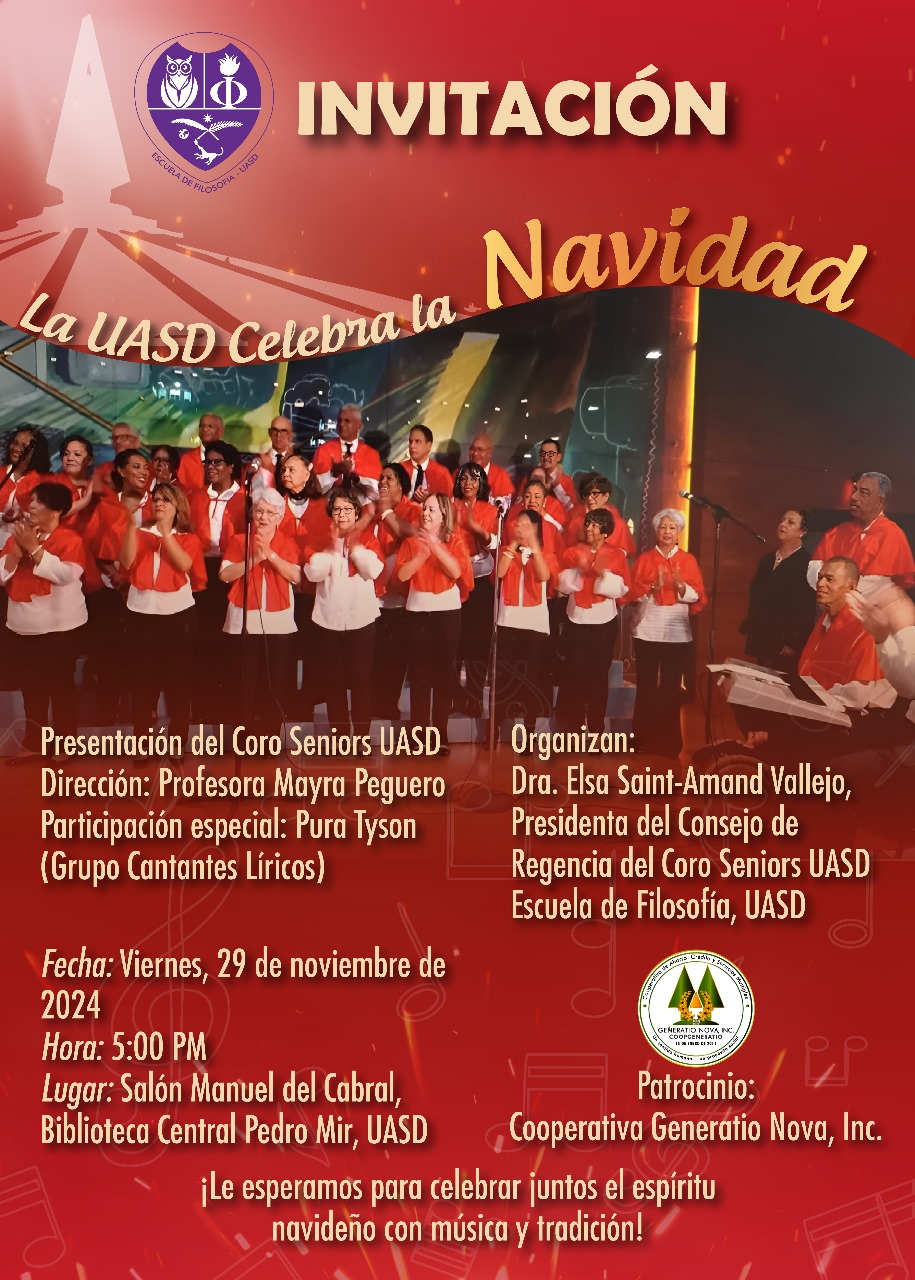 CulturaCoro de la UASD celebrará Navidad con Pura Tyson y otros cantantes líricos by Redacción noviembre 22, 2024 written by Redacción noviembre 22, 2024 La celebración será el viernes 29/11 desde las 5 pm en la biblioteca Pedro Mir. 0 comment 0 FacebookTwitterPinterestEmailRedacción previous post Movimiento de Mujeres Trabajadoras reclama justicia en caso Paula Santana next post Haití: ONU llama a transformar compromisos en acciones You may also like GALERÍA: presidente Abinader asiste a Feria Regional del... abril 27, 2026 Dantes Ortiz hablará sobre Insurrección de Abril en... abril 24, 2026 10 razones que hacen distinta y especial la... abril 23, 2026 GALERÍA: Rinden homenaje a escritores de Montecristi en... abril 20, 2026 GALERÍA: Muestran primeras exposiciones de la Feria Regional... abril 18, 2026 Panel destaca coincidencias antimperialistas entre Cuba y Dominicana abril 17, 2026 Celebrarán Feria Regional del Libro en Santiago abril 16, 2026 Siembra de libros en El Gramazo: cuando la... abril 12, 2026 GALERÍA: Juramentan clubes de lectura en Instituto Tecnológico... abril 10, 2026 VIAJES: Domingo de Resurrección sevillano abril 5, 2026