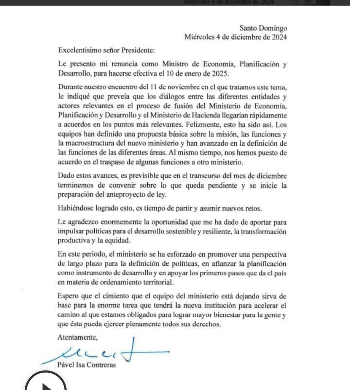 NacionalesPável Isa Contreras renuncia del Ministerio de Economía, Planificación y Desarrollo by Redacción diciembre 13, 2024 written by Redacción diciembre 13, 2024 El conocido economista envió una carta al presidente Luis Abinader con fecha 4/12 y efectividad para el 10 de enero del 2025. 0 comment 0 FacebookTwitterPinterestEmailRedacción previous post Llega la IV Jornada de Reflexión Literaria Santo Domingo 2024 next post Continuarán las temperaturas agradables y oleajes anormales en las costas You may also like ¡Trabajar para que nos inunde el gesto que... abril 26, 2026 Cruz Roja Dominicana mantiene operaciones en provincias afectadas... abril 26, 2026 Movimiento Caamañista y FR presentan línea política este... abril 25, 2026 La violencia infantil abril 25, 2026 Lluvias e inundaciones a través del territorio nacional abril 24, 2026 Experiencias de Abril del 65 abril 24, 2026 CATALEJO: Hegemonía en declive abril 24, 2026 Obreros se unen al llamado a concentración frente... abril 24, 2026 BCRD informa que los flujos de remesas alcanzaron... abril 24, 2026 Coalición por la Seguridad Social Digna llama apoyar... abril 23, 2026