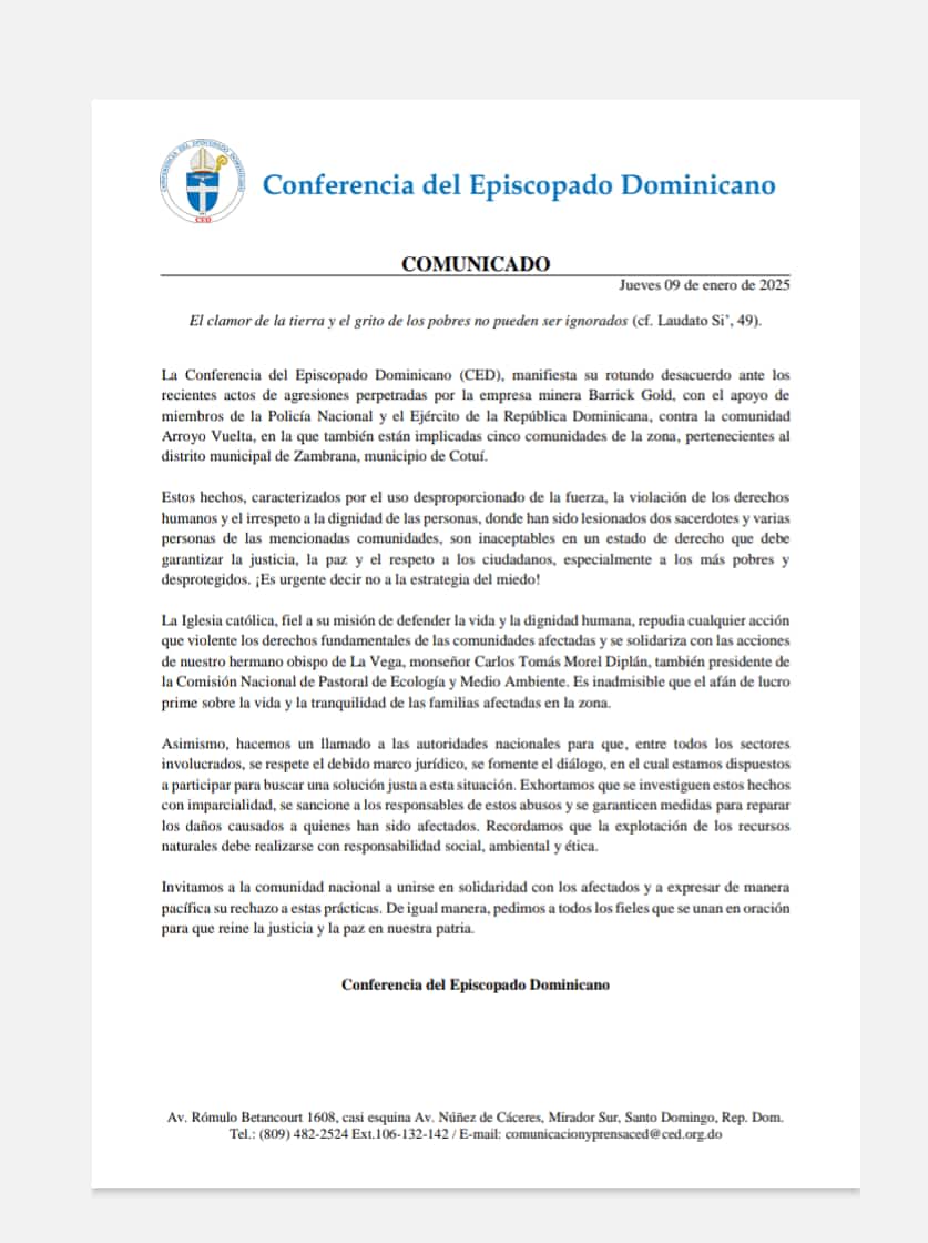 Los arzobispos y obispos de la Iglesia Católica defienden el derecho de los campesinos de Cotuí a la tierra contra las pretensiones de la Barrick Gold.