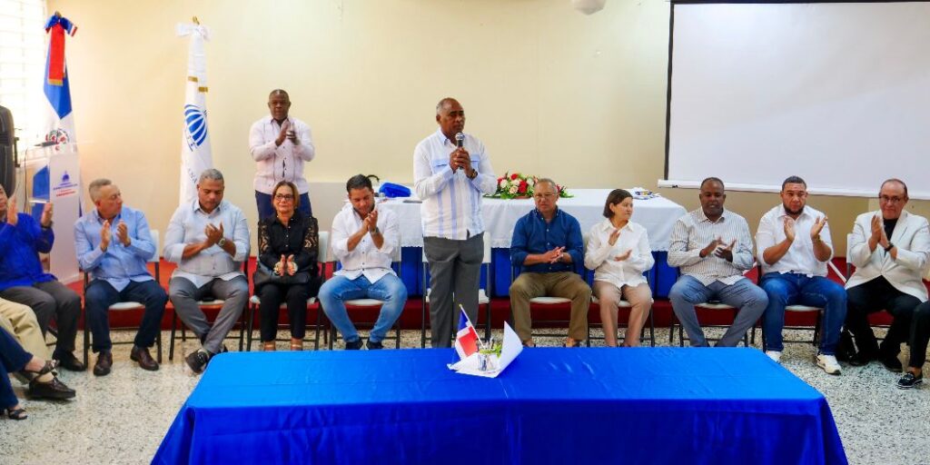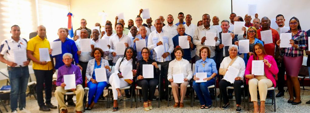 Representantes de diversas instituciones, oficiales y privadas, muestran el documento firmado por el desarrollo sostenible de la provincia. En el centro, el senador Julito Fulcar, director del comité coordinador.