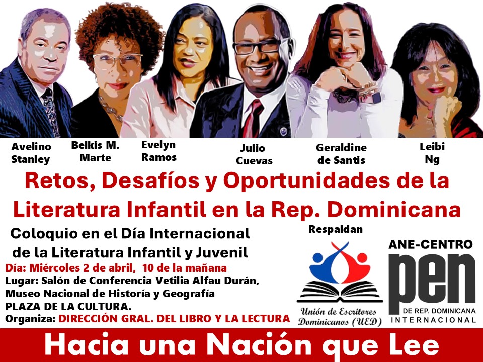 La actividad es organizada por la Dirección del Libro y la Lectura del Ministerio de Cultura con motivo del Día Internacional del Libro Infantil y Juvenil con el auspicio de Unión de Escritores Dominicanos y el centro PEN de República Dominicana, y será realizada en el Museo de Historia en la Plaza de la Cultura Juan Pablo Duarte este martes 2 de abril a partir de las 10 de la mañana.