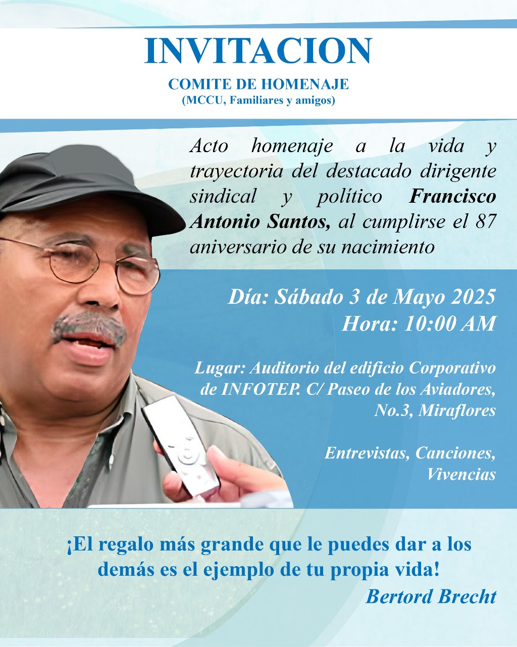 El acto se realizará el sábado tres de mayo en el edificio central de INFOTEP. Santos fue un combativo dirigente popular de final del siglo pasado, fundador de la Central General de Trabajadores.