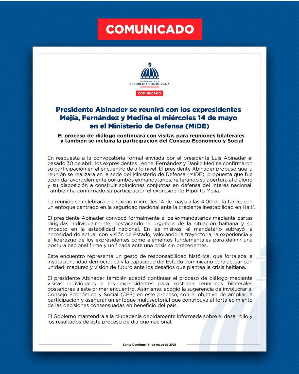 El encuentro de Luis Abinader con Hipólito Mejía, Leonel Fernández y Danilo Medina se hará este miércoles 14 en el Ministerio de Defensa, para tratar las relaciones con Haití.