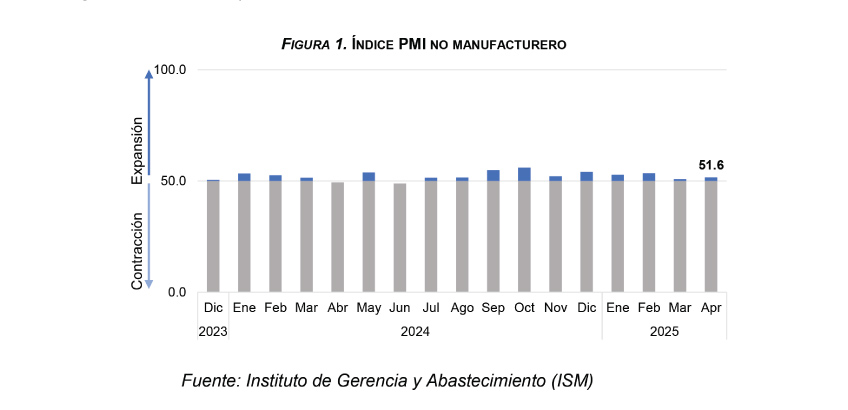 Del mismo modo, el índice de gestores de compras (PMI, por sus siglas en inglés) no manufacturero del Instituto de Gerencia y Abastecimiento (ISM) registró un valor de 51.6 en el mes de abril indicando el décimo mes consecutivo en expansión, mostrando un crecimiento moderado del sector servicios norteamericano, donde se emplea una parte significativa de la diáspora dominicana.