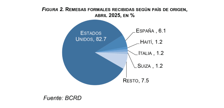 Con respecto a la distribución de las remesas recibidas por provincias, el BCRD señala que el Distrito Nacional recibió una proporción del 37.5 % durante abril, seguido por las provincias de Santiago y Santo Domingo, con un 13.0 % y 8.0 %, respectivamente. Esto revela que más de la mitad (58.5 %) de las remesas se recibe en las zonas metropolitanas del país.