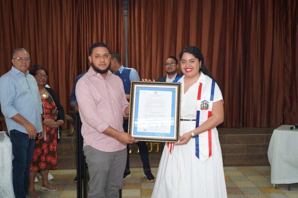 El presidente de la asamblea de regidores(as) de Montecristi, Dayan Méndez, entrega un pergamino a Débora.