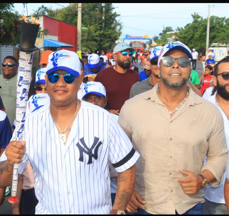 Los peloteros montecristeños Starlin Castro y Nelson Cruz llevan la antorcha hacia la inauguración de los Juegos Fronterizos.