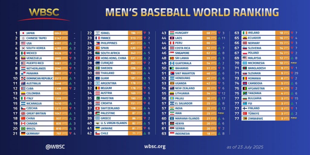 La República Dominicana se encuentra en Tainan, Taiwán, en donde son parte de la Copa Del Mundo Sub-12 WBSC 2025 evento puntuable dentro del Ranking Mundial en donde como país desde el 25 de julio y hasta el 3 de agosto buscarán los puntos para continuar su avance, escalando posiciones y trayendo a la casa la corona de campeones.