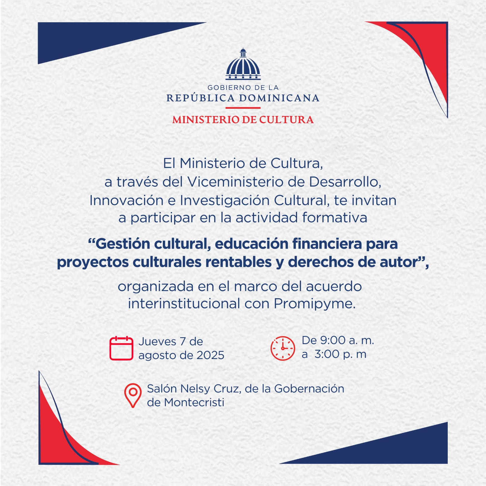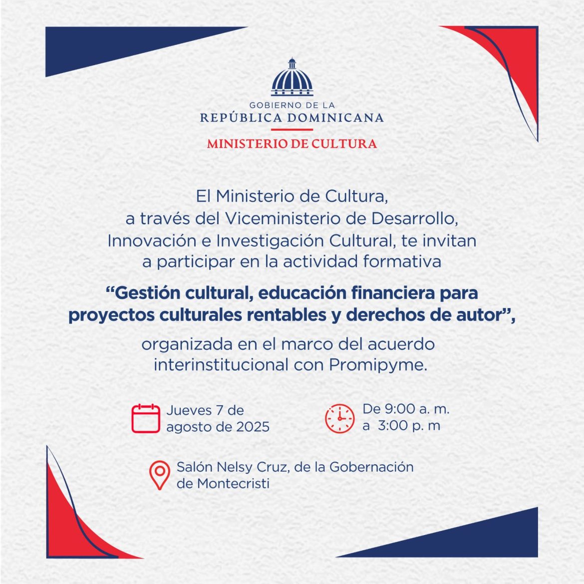 MontecristiMinisterio de Cultura realizará taller en gobernación de Montecristi este jueves 7 by Redacción agosto 5, 2025 written by Redacción agosto 5, 2025 La actividad formativa se efectuará desde las 9.oo am hasta las 3 de la tarde, dirigida a los activistas culturales. 0 comment 0 FacebookTwitterPinterestEmailRedacción previous post Economía dominicana registra crecimiento interanual de 2.4 % en enero-junio de 2025 next post RD avanza hacia una meta vital: “hambre cero” You may also like GALERÍA: Iván Marichal retrata las bellezas de Montecristi abril 22, 2026 GALERÍA: Rinden homenaje a escritores de Montecristi en... abril 20, 2026 GALERÍA: Alcaldía de Castañuelas continúa construcción de aceras... abril 19, 2026 GALERÍA: Muestran primeras exposiciones de la Feria Regional... abril 18, 2026 Daygorod Fabián analiza rol del maestro dominicano en... abril 17, 2026 En barrio Los Garajes de Montecristi claman por... abril 16, 2026 GALERÍA: Decenas de personas de Carbonera protestan ante... abril 15, 2026 GALERÍA: Federación de Juntas de Vecinos Anita celebra... abril 12, 2026 Profesores de Guayubín reclaman reparaciones de aulas y... abril 11, 2026 Montecristi y el Cibao central están en alerta... abril 10, 2026