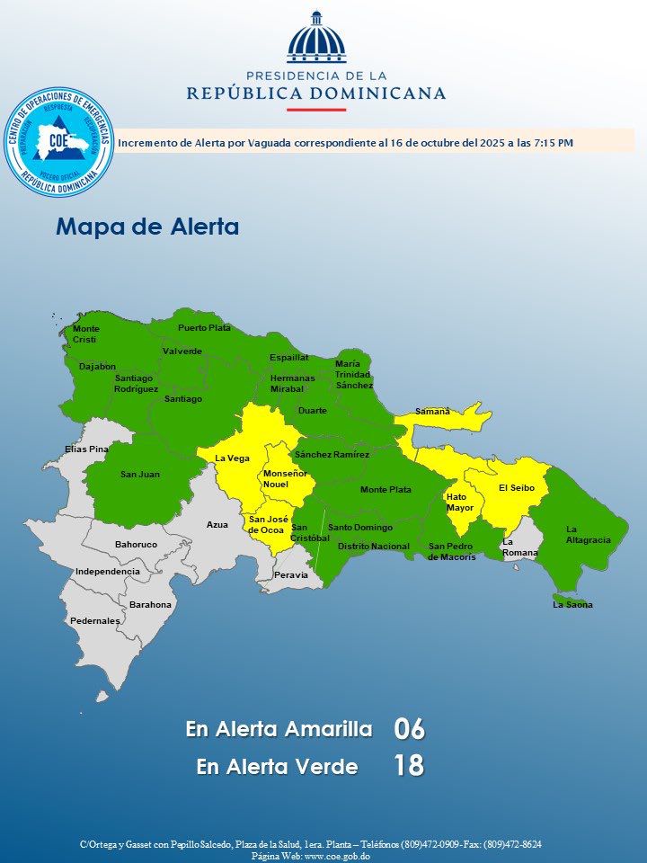 NacionalesAumentan a 24 las provincias en alerta en toda la RD, seis de ellas en amarillo by Redacción octubre 17, 2025 written by Redacción octubre 17, 2025 El Centro de Operaciones de Emergencias (COE) emite la alerta por las más recientes lluvias sobre el territorio dominicano. 0 comment 0 FacebookTwitterPinterestEmailRedacción previous post Diversas entidades llaman a marchar hacia el Palacio Nacional este domingo 19 next post La administración Trump intensifica la guerra contra Venezuela You may also like La violencia infantil abril 25, 2026 Lluvias e inundaciones a través del territorio nacional abril 24, 2026 Experiencias de Abril del 65 abril 24, 2026 CATALEJO: Hegemonía en declive abril 24, 2026 Obreros se unen al llamado a concentración frente... abril 24, 2026 BCRD informa que los flujos de remesas alcanzaron... abril 24, 2026 Coalición por la Seguridad Social Digna llama apoyar... abril 23, 2026 Tutumpotes: ¡Paguen su crisis! abril 23, 2026 Consulados depositarán en Cuenta Única del Tesoro (CUT) abril 21, 2026 Realizan protesta en Yaguate, San Cristóbal, en reclamo... abril 20, 2026