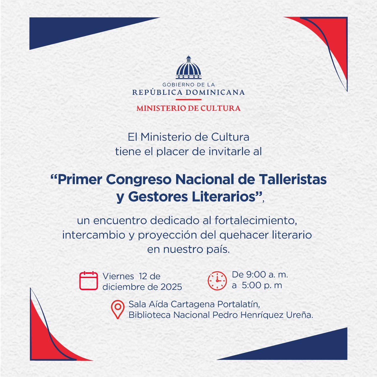 «Vamos a intercambiar cómo podemos ampliar, profundizar y promover la formación de talleres literarios y la producción y consumo de literatura en nuestro país», se afirma en una declaración del Ministerio de Cultura. El encuentro será de 9:00 am a 5:00 pm en la Biblioteca Nacional Pedro Henríquez Ureña. Con un reconocimiento especial a Mateo Morrison.