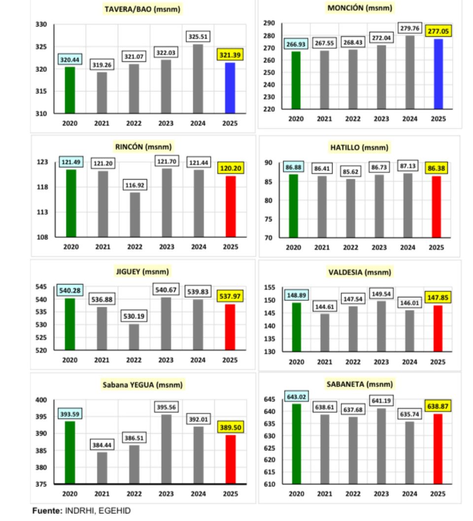 7. Sabana Yegua con una cota en 2025 de 389.50msnm, o sea, unos -4.09 metros MENOS que en el año 2020 y -2.51 metros MENOS que el 31 de diciembre del 2024.